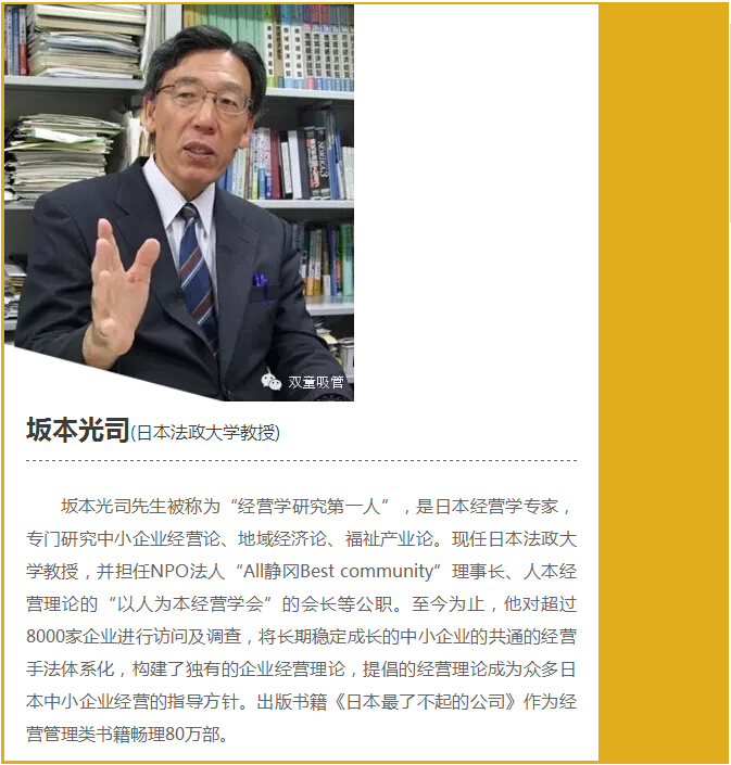 早在2016年,坂本光司老師就曾帶隊來(lái)到“雙童”實(shí)地參觀(guān),并和“雙童”樓仲平進(jìn)行了深度交流,高度認可了“雙童”的人本經(jīng)營(yíng)模式。在此后,不斷有日本企業(yè)主團隊來(lái)“雙童”調研學(xué)習,樓仲平也數次受邀前往日本各所大學(xué)授課,分享“雙童”的利他經(jīng)營(yíng)理念和企業(yè)文化,引發(fā)了日本企業(yè)界的強烈關(guān)注!