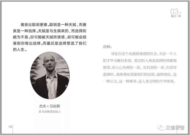 首先,就是晨讀環(huán)節。“雙童”所有員工在上班之前都會(huì )在統一時(shí)間誦讀“雙童”的企業(yè)文化叢書(shū)——《每日一則》。這本《每日一則》里,共收錄了31句名人經(jīng)典語(yǔ)錄,以月度為單位讓員工進(jìn)行重復誦讀,內容包含了專(zhuān)注、創(chuàng )新、共贏(yíng)、正氣等主題。這可是員工們從幾千條好句里挑出來(lái),并且自己解析的呢!