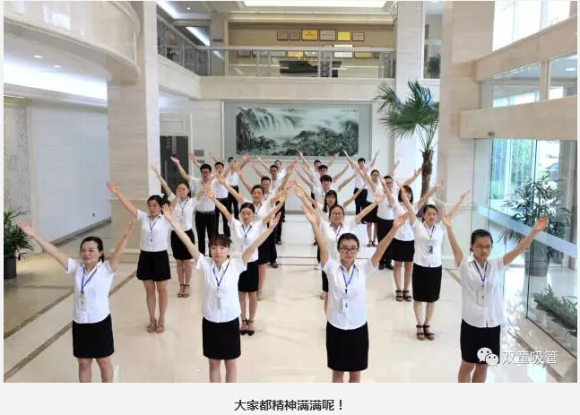 除了精神上要得到提升之外,我們的身體素質(zhì)也非常重要!每天,在晨讀環(huán)節結束之后,我們都會(huì )進(jìn)行早操活動(dòng)。俗話(huà)說(shuō),“一年之際在于春,一天之際在于晨”。在“雙童”行政大廳,員工們列隊整齊,精神飽滿(mǎn),氣宇軒昂,伴著(zhù)豪邁的音樂(lè ),用整齊劃一的動(dòng)作做起早操,形成了一道靚麗的風(fēng)景線(xiàn)。