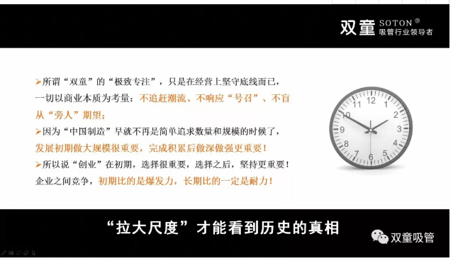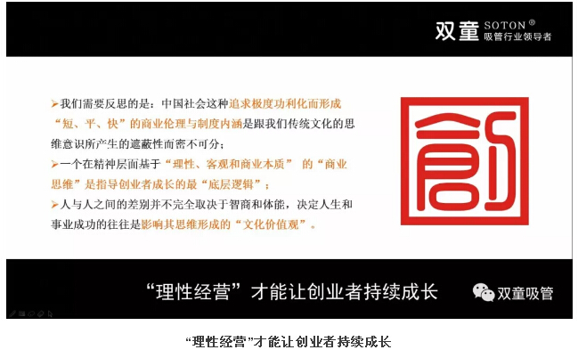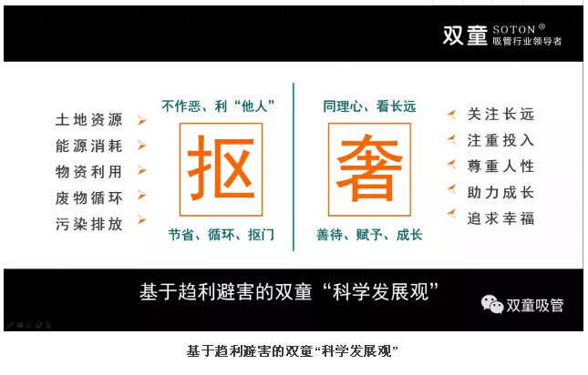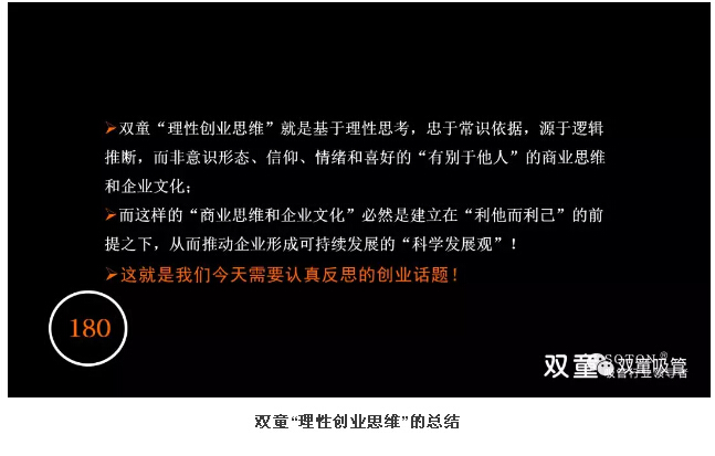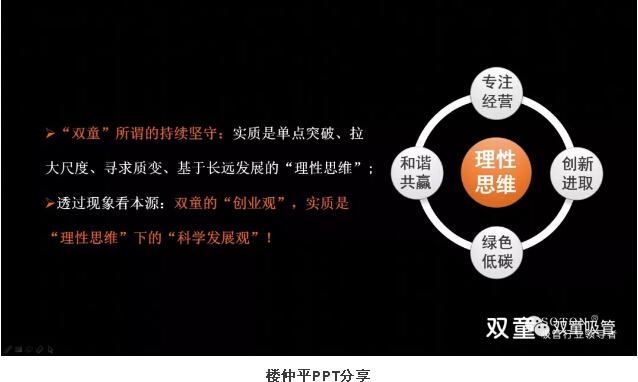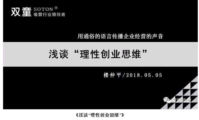 當我們透過(guò)現象看本源,雙童的“創(chuàng )業(yè)觀(guān)”,實(shí)質(zhì)是單點(diǎn)突破、拉大尺度、尋求質(zhì)變、基于長(cháng)遠發(fā)展的“理性思維”,實(shí)質(zhì)是“理性思維”下的“科學(xué)發(fā)展觀(guān)”!