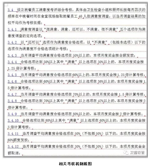 對此,公司組織人員編寫(xiě)了餐飲管理細則,涉及到餐飲管理的各個(gè)方面,從餐飲管理成本、廚師上崗要求、廚房崗位工作權責、餐費管理原則、食堂衛生保障、員工滿(mǎn)意度調查等方面進(jìn)行一一細化,每項內容都有具體的實(shí)施條例!