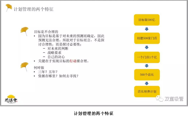 首先,趙宜萱博士和大家分享了“計劃管理”的定義,計劃是一個(gè)很特殊的管理手段,它是為實(shí)現目標而尋找資源的一系列行動(dòng)。企業(yè)的每一位員工都必須從高管、中層、基層的角度,分別對企業(yè)戰略、戰略實(shí)施舉措以及行動(dòng)計劃有一定的理解和定位才能夠做好企業(yè)的行動(dòng)計劃。“計劃管理”從制定計劃開(kāi)始,到執行計劃,到檢查最終的結果,是一個(gè)循環(huán)的過(guò)程。