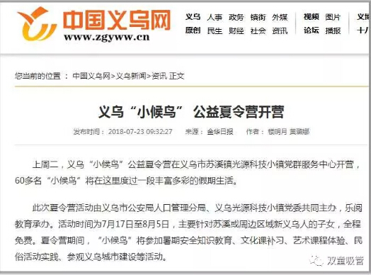 每年暑假,我們的城市都有一群來(lái)自遙遠他鄉的“小候鳥(niǎo)”,與在外務(wù)工的父母團聚。為了讓“小候鳥(niǎo)”們在義烏度過(guò)快樂(lè )時(shí)光,義烏市北苑街道辦事處、團委等單位特地聯(lián)合主辦了2018“同心牽手,快樂(lè )義夏”的小候鳥(niǎo)夏令營(yíng)活動(dòng)!