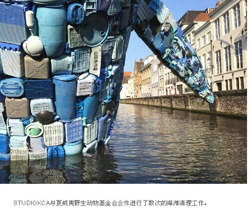美國STUDIOKCA事務(wù)所從太平洋撤出了5噸塑料廢物,用這些海洋垃圾變成了一個(gè) 4 層樓高的鯨魚(yú)雕塑,作品名為“摩天大樓(布魯日鯨魚(yú))”。