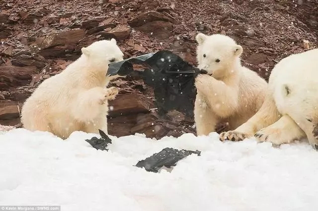 兩只小北極熊把一塊黑色塑料當成了玩具