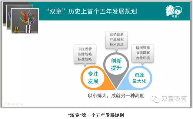 所以,“雙童”在這樣的背景下,提出了“以小博大,成就另一種高度”這句企業(yè)座右銘,來(lái)引領(lǐng)和激勵企業(yè)的發(fā)展。正是在這句座右銘的引導下,“雙童”摒棄了浮躁,抗拒了誘惑,通過(guò)不斷地努力、進(jìn)取和創(chuàng )新,把一根小小的吸管做到極致,做成了全球吸管領(lǐng)導者!