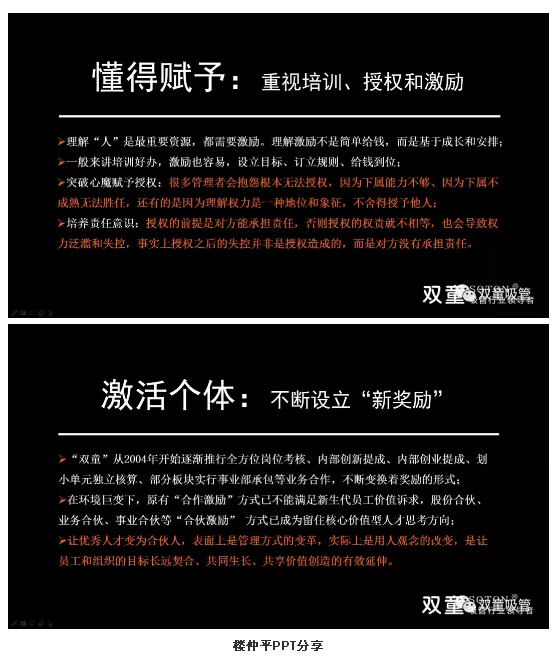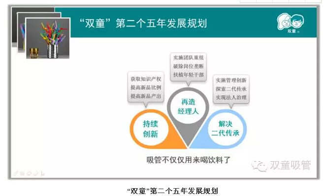 現在,公司有二三十個(gè)中高層,平均工齡10年以上,年齡30歲左右,都是我一個(gè)個(gè)帶出來(lái)的,“雙童”做的吸管是一個(gè)比較偏門(mén)的行業(yè),沒(méi)有行業(yè)的通用性人才,所以我們基本不用空降兵。這批人是我帶出來(lái)的,就深受我的影響,在乎工作、可以放下身段,整體素質(zhì)遠超第一代管理者。這批第二代管理者培養起來(lái)后,至少打開(kāi)了“雙童”未來(lái)二十多年企業(yè)持續發(fā)展的窗口。
