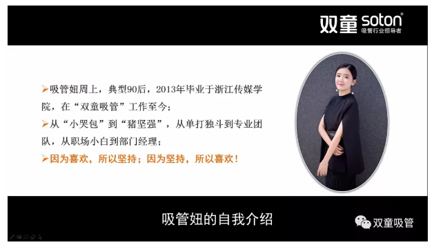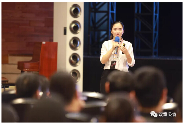 介紹完自己,吸管妞也通過(guò)一系列圖片,從企業(yè)創(chuàng )新、行業(yè)地位、生態(tài)環(huán)境、品牌塑造和人文關(guān)懷方面介紹了“雙童”,使在座聽(tīng)眾對企業(yè)有了大致上的認知和了解。