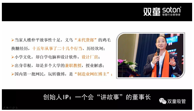 首先,就是“創(chuàng )始人IP”?!半p童”樓仲平的故事性十足,有義烏“末代貨郎”的雞毛換糖經(jīng)歷,十五年從事了二十幾個(gè)行當、歷經(jīng)坎坷。他是國內第一批網(wǎng)民,是“制造業(yè)網(wǎng)紅博主”;他出生草根,卻是多個(gè)大學(xué)的兼職教授,為學(xué)生和創(chuàng )業(yè)者們授業(yè)解惑……通過(guò)挖掘當家人樓總的精彩故事和人物亮點(diǎn),“雙童”形成了創(chuàng )始人IP。
