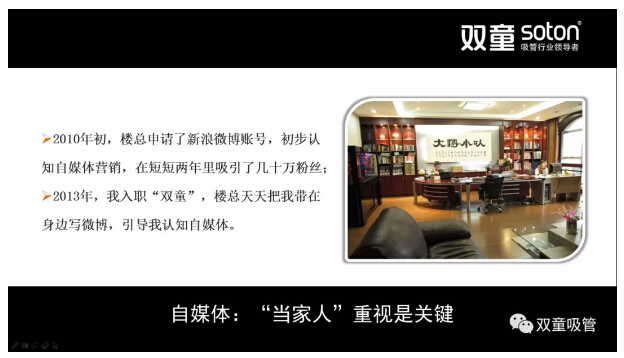 2010年后,自媒體給“雙童”的品牌傳播帶來(lái)了極大的發(fā)展機遇?!半p童”當家人樓仲平認知到一個(gè)好的品牌并不是完全靠廣告砸出來(lái)的,中小企業(yè)可以通過(guò)塑造企業(yè)文化IP,講好企業(yè)的故事,形成品牌的傳播!