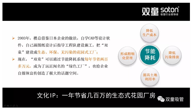 2003年,“雙童”借鑒日本企業(yè)的做法,在建廠(chǎng)之初建設的雨水收集等節能降耗設施,每年省下兩百多萬(wàn)元,成為了遠近聞名的“綠色工廠(chǎng)”。在節約資源、節省成本的同時(shí),這些舉措也給企業(yè)自媒體宣傳創(chuàng )造了極大的話(huà)題空間。