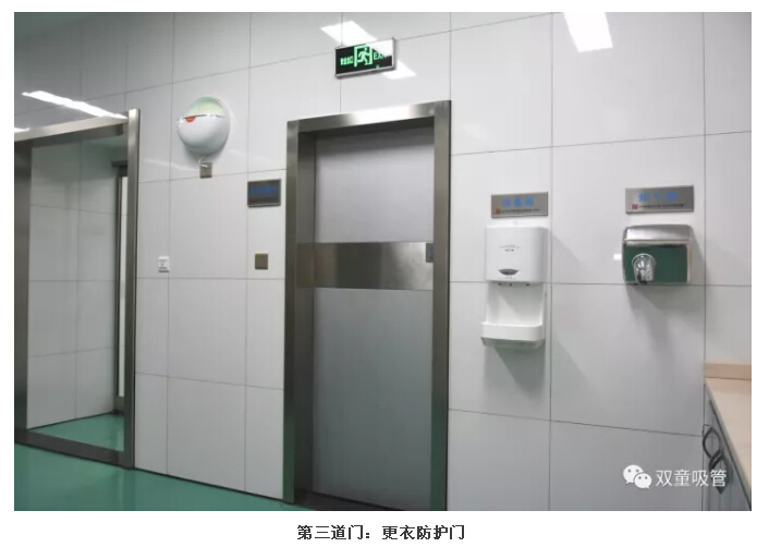 3.經(jīng)過(guò)了兩道防護門(mén)后,員工們更衣后通過(guò)更衣防護門(mén)進(jìn)入洗手消毒區域。