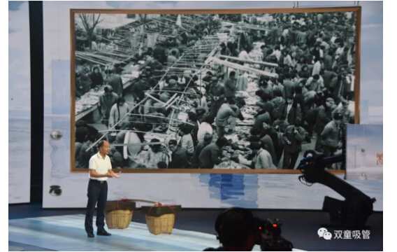 在節目現場(chǎng),“雙童”樓仲平也帶來(lái)了許多精彩的照片。其中,開(kāi)場(chǎng)照片便是義烏這座城市的對比照片。通過(guò)挑貨郎與義烏小商品城開(kāi)展全球電商的照片對比,樓仲平講述了義烏如何從貧瘠落后的小縣城發(fā)展為全球最大的小商品集散中心的故事……
