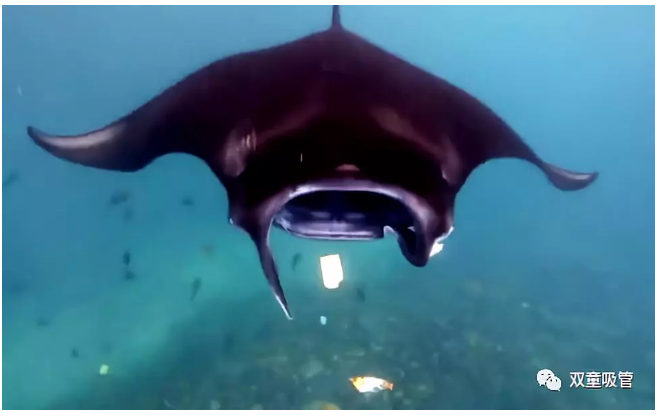 一只蝠鲼在滿(mǎn)是塑料垃圾的海洋中游來(lái)游去,還吞下了一塊塑料垃圾!