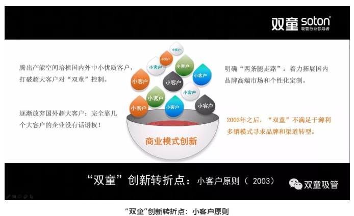 所以,這個(gè)時(shí)候我們逐漸放棄國外一些大客戶(hù),開(kāi)始實(shí)施小客戶(hù)原則,到現在積累了16000多家中小客戶(hù),從而讓“雙童”不會(huì )受客戶(hù)所限。