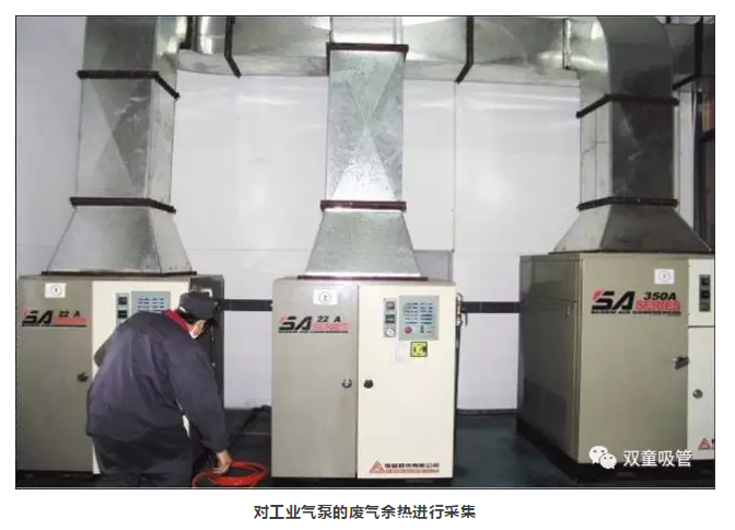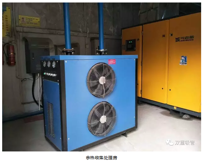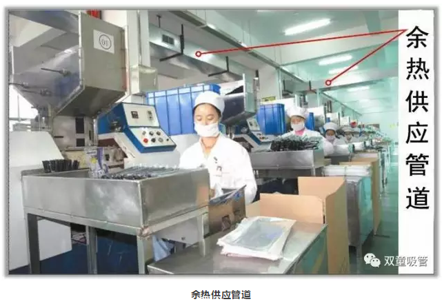 考慮到“雙童”生產(chǎn)設備產(chǎn)生大量余熱的狀況,我們在所有的設備上安裝了余熱采集裝置,把所有生產(chǎn)設備的余熱和廢氣進(jìn)行采集并回收,采集的余熱經(jīng)過(guò)凈化處理后再通過(guò)管道供應給所有車(chē)間進(jìn)行二次能源的利用(原來(lái)需要的熱空調現在不用了,節能了大量的電費)!