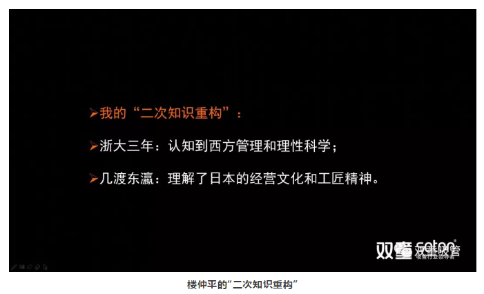 于是,他選擇到浙大學(xué)習進(jìn)修五年,沉下心來(lái),拿起書(shū)本,重新開(kāi)始學(xué)習,并在這期間積累了不少管理理念和商業(yè)知識,努力向知識界和學(xué)術(shù)界靠攏!