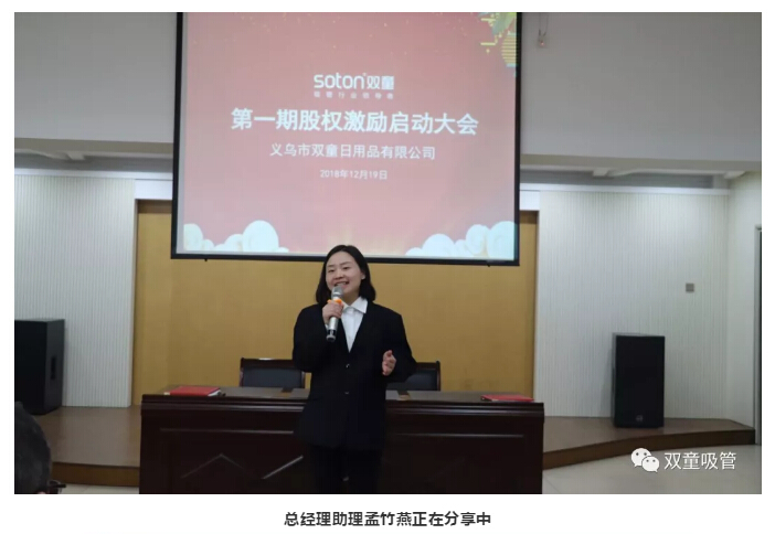 2018年12月19日,對“雙童”來(lái)說(shuō),是代表著(zhù)夢(mèng)想、激情、奮斗的一天!在這一天,雙童吸管第一期股權激勵啟動(dòng)大會(huì )在“雙童”九樓閣隆重舉行!“雙童”首批12位核心員工將成為“雙童”的經(jīng)營(yíng)伙伴,一起互相陪伴,走向未來(lái)!