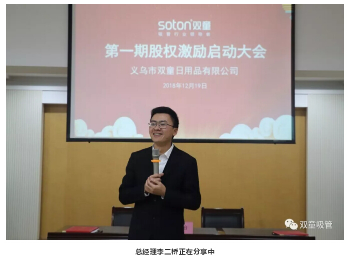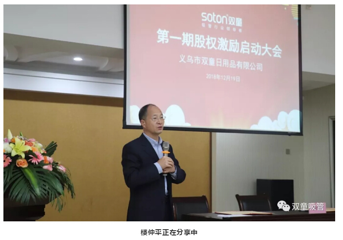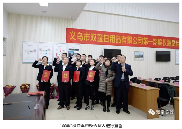 “今天,我從樓總手上接過(guò)股權激勵的證書(shū),我的內心更加激動(dòng)和深刻,我的角色轉變?yōu)楣竞匣锶?。但這也只是一個(gè)開(kāi)始,未來(lái),我們或許會(huì )經(jīng)歷很多的困難,但我始終相信我們可以完成5年后的目標。讓我們在一起少一些抱怨,多一些團結,多一些付出,為‘雙童’更好的明天努力奮斗!”