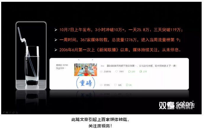 10月,“正和島”微信平臺報道“雙童”的一篇《靠0.0008元利潤干到全球第一,義烏這位老板,給中國制造上了一課!》文章一上線(xiàn),在僅僅3小時(shí)的時(shí)間里便創(chuàng )造了10萬(wàn)+閱讀的好成績(jì),僅一周時(shí)間,引起上百家媒體轉載,總流量達到1276萬(wàn),進(jìn)入當周微信流量排行榜,引起社會(huì )極大關(guān)注!