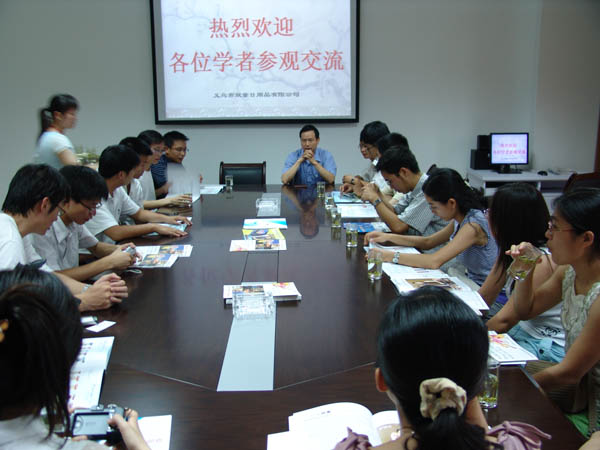 2007年7月27日在義烏市人才交流中心余科長(cháng)的帶領(lǐng)下,清華、人大博士研究生13人來(lái)我司參觀(guān)交流。公司張國俊副總對學(xué)者們的到來(lái)致歡迎詞,并對學(xué)者們的提問(wèn)做了一一解答和交流。公司辦公室主任盧程航做了熱情接待,對公司情況做了詳細介紹,并陪同學(xué)者們在員工寢室、車(chē)間等廠(chǎng)區進(jìn)行了參觀(guān)。