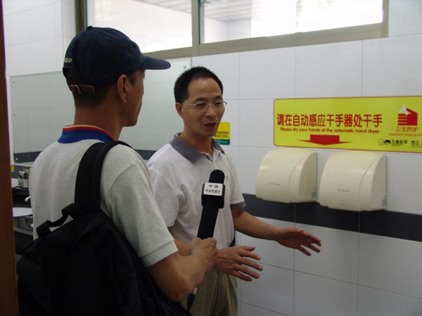 上圖為公司董事長(cháng)樓仲平先生(圖左)在解說(shuō)雙童公司特有的“廁所文化”