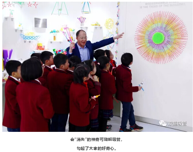 每到一個(gè)吸管展示區域時(shí),孩子們都緊緊跟在“雙童”樓仲平的身后,認真用心聆聽(tīng)!相比于傳統吸管,造型奇特并擁有各種不同功能的創(chuàng )新吸管更是引起了孩子們的濃厚興趣。