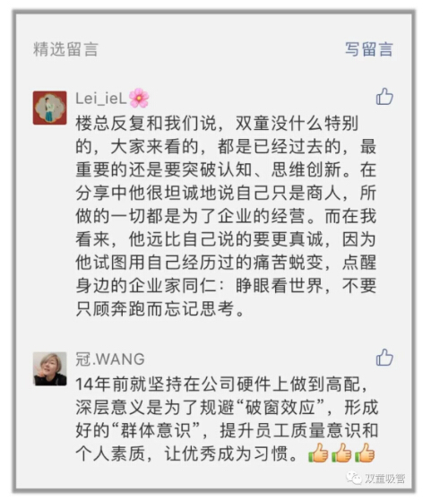 我和樓總其實(shí)之前就認識,2017年我帶著(zhù)中高層來(lái)過(guò),但是今天來(lái),感覺(jué)變化很大、企業(yè)文化建設很完善。您剛才提到2016、2017年企業(yè)的陣痛我之前沒(méi)想到,我們公司也是近兩年進(jìn)入快速發(fā)展期,人才跟不上。原來(lái)想踩剎車(chē)、慢一點(diǎn),現在我更堅定要跑快一點(diǎn)。今年,我決定我們整個(gè)公司就定下來(lái)要學(xué)習“雙童”。