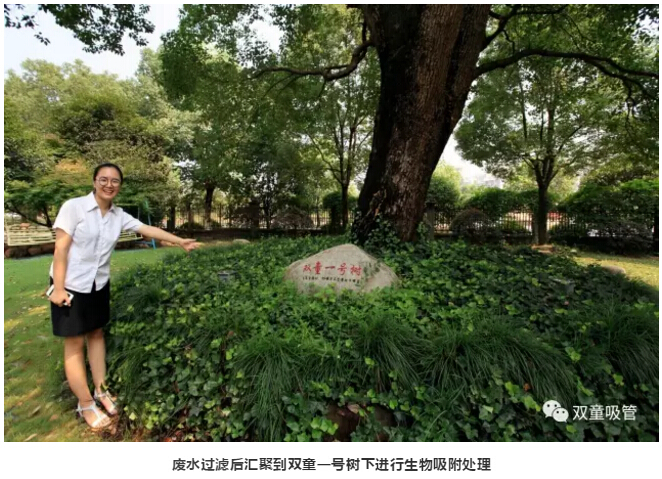 “雙童”廢水收集處理循環(huán)系統,就是將員工用的生活廢水過(guò)濾到“ 雙童一號樹(shù)”下進(jìn)行生物吸附處理,流入中水儲存池,并為廠(chǎng)區所有衛生間的馬桶沖水、綠化噴淋和道路清洗、車(chē)輛清洗所用,使公司的員工生活用水量節省了65%,每年為公司節省水費支出40多萬(wàn)元!