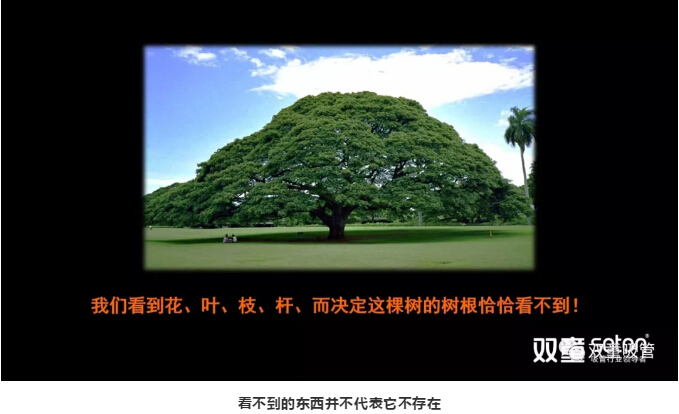 樓仲平通過(guò)“雙童”的圖集案例,引導大家認知到,原來(lái)平常司空見(jiàn)慣的思維認知并不一定是正確的。隨后,樓仲平通過(guò)一棵樹(shù)的圖片,再次引導大家思考:我們通過(guò)圖片能看到樹(shù)的樹(shù)干、樹(shù)枝、樹(shù)葉等等,但是真正決定這棵樹(shù)的樹(shù)根,卻并不能直接看到。
