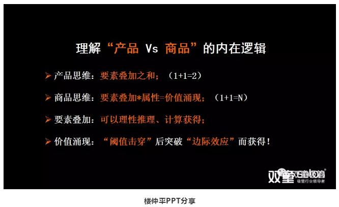 樓仲平引導大家思考“產(chǎn)品 Vs 商品”的關(guān)系,在這個(gè)模型中,產(chǎn)品本身(一根吸管)只是組成“商品”的基礎核心,產(chǎn)品只是企業(yè)的一個(gè)載體,是最基本的成本相加,1+1=2。