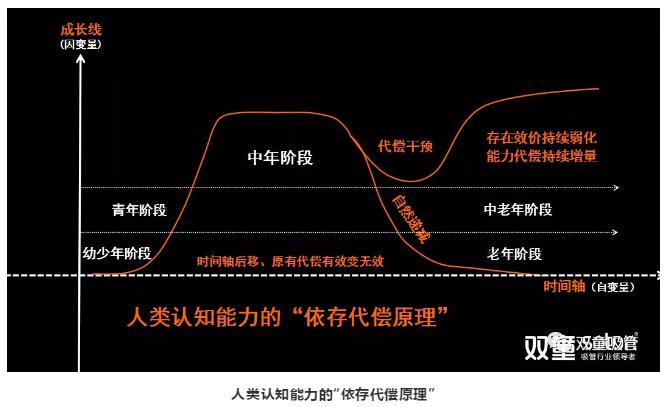 在該模型中,我們能夠看到人類(lèi)的認知從幼少年階段開(kāi)始,經(jīng)過(guò)青年階段,到達中年階段的巔峰期。但隨著(zhù)年齡的不斷增長(cháng),人類(lèi)的認知能力開(kāi)始自然遞減,最終接近幼少年時(shí)期的認知能力。在這個(gè)過(guò)程中,如果人類(lèi)想要改變這一自然的“墮變規律”,就必然需要通過(guò)“代償干預”,對自身進(jìn)行不斷地調整和干預,從而讓認知能力從“下墮”走向“上揚”,讓能力代償持續增量!