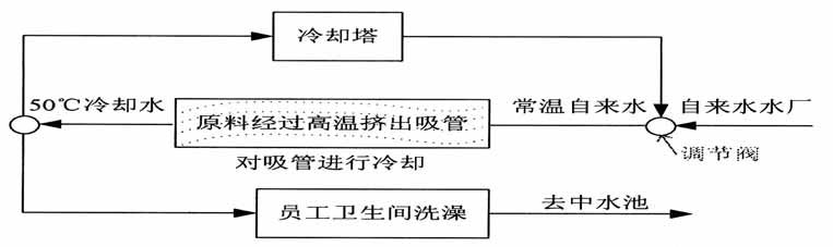 (二)設計構想:工業(yè)循環(huán)用水,旨在大量節省自來(lái)水,通過(guò)冷卻塔對50 多度水溫降低到常溫,再進(jìn)行車(chē)間冷卻吸管用;生產(chǎn)熱水回用,主要能把50 多度冷卻水用于員工洗澡,把熱水的原始功能加以利用。