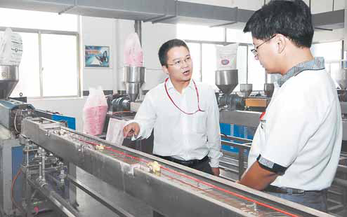 在雙童的生產(chǎn)工藝流程中,有這樣一個(gè)環(huán)節,叫做原料經(jīng)過(guò)高溫擠出吸管,“擠”出來(lái)的吸管需要用水來(lái)冷卻。過(guò)去,企業(yè)多用自來(lái)水對吸管進(jìn)行冷卻,冷卻以后,這些50 多度的熱水便被作為廢水進(jìn)行直接排放。也就是說(shuō),車(chē)間一邊進(jìn)自來(lái)水,一邊又馬上把冷卻水當廢水放掉了。毫無(wú)疑問(wèn),這對用水量很大的雙童公司來(lái)說(shuō),是一筆不小的成本投入。善于精打細算的樓仲平自然不甘做這種賠本生意,經(jīng)過(guò)摸索,經(jīng)濟驅動(dòng)力催生出一套他自行研發(fā)設計的“工業(yè)循環(huán)用水回用系統”:在生產(chǎn)上, 50 多度的冷卻水通過(guò)冷卻塔降到常溫,再抽回車(chē)間,二次行使冷卻吸管的重任。它的功效在哪里?可以打個(gè)比方:假如企業(yè)擴大規模后車(chē)間設備增加3 倍,那么沿襲一次性排放,用水量也是直接增加3 倍;而采用循環(huán)用水,企業(yè)用水量卻只增加1 倍。效果立時(shí)可顯?!耙皇B(niǎo)”、“一箭雙雕”、“一舉兩得”,用怎樣的語(yǔ)言來(lái)形容這個(gè)“水循環(huán)系統”都不為過(guò)。因為,除了生產(chǎn),“水循環(huán)系統”還有一個(gè)更大的妙用,這就是:一個(gè)“熱水回用”給員工洗澡解了天大的難題—— — 冷卻水吸收過(guò)吸管中的熱量后,可使水溫達到約50 多度,公司便“順手牽羊”把部分冷卻水抽到員工衛生間,作為洗澡熱水使用?!安徽f(shuō)別的,員工洗澡不用再受制于‘煙熏火燎’的鍋爐了!單就這一點(diǎn),想想就覺(jué)得爽氣?!睒侵倨降脑?huà)語(yǔ)里,透著(zhù)一種喜不自禁。他也確實(shí)有值得高興的理由:過(guò)去,職工洗澡用水都是靠燒煤鍋爐供給員工洗澡水時(shí),不但需要專(zhuān)門(mén)的堆煤場(chǎng)和煤渣堆場(chǎng),“晴天揚塵,雨天濁流”,環(huán)境污染嚴重,而且,耗費不菲—— — 一個(gè)鍋爐,平均每年用煤60 噸;需專(zhuān)門(mén)配備持證鍋爐工,每年一鍋爐工工資即需5 萬(wàn)元。