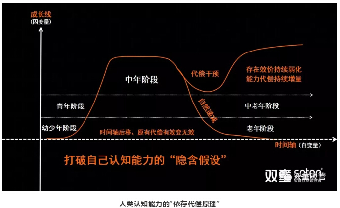 在該模型中,我們能夠看到人類(lèi)的認知從幼少年階段開(kāi)始,到達中年階段的巔峰期。但隨著(zhù)年齡的不斷增長(cháng),人類(lèi)的認知能力開(kāi)始自然遞減,最終接近幼少年時(shí)期的認知能力。在這個(gè)過(guò)程中,如果想要改變這一自然的“墮變規律”,就必然需要通過(guò)“代償干預”,對自身進(jìn)行不斷地調整和干預,從而讓認知能力從“下墮”走向“上揚”,讓能力代償持續增量!