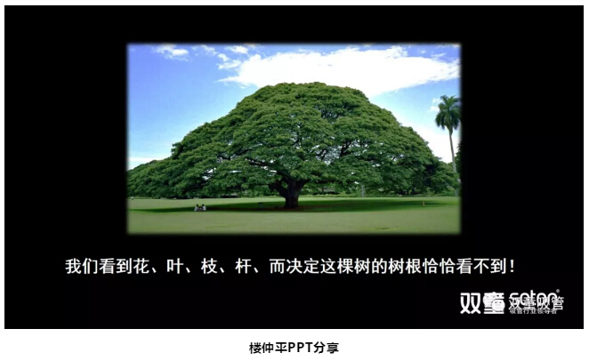 緊接著(zhù),樓仲平通過(guò)一棵樹(shù)的圖片,再次引導大家思考:我們通過(guò)圖片能看到樹(shù)的樹(shù)干、樹(shù)枝、樹(shù)葉等,但是真正決定這棵樹(shù)的樹(shù)根,卻并不能直接看到。