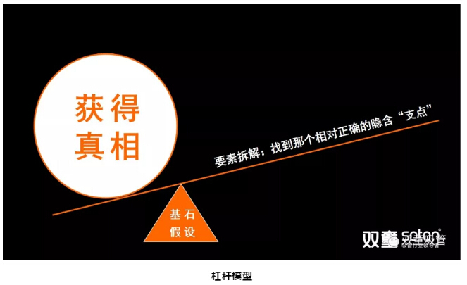 它背后的邏輯其實(shí)很簡(jiǎn)單,即通過(guò)不斷地要素拆解,找到相對正確的“基石假設”,把它作為一個(gè)支點(diǎn),從而撬動(dòng)了思維。