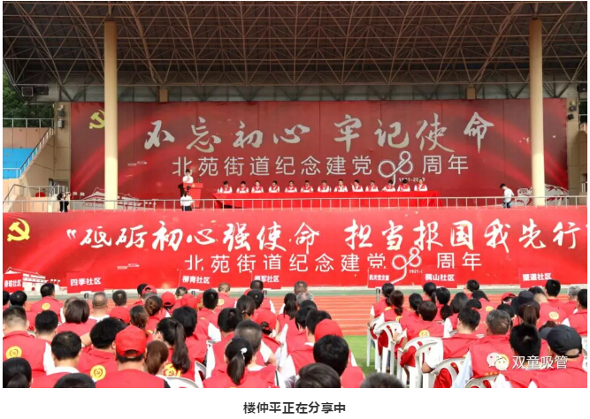 這不,6月29日上午,北苑街道為紀念中國共產(chǎn)黨成立98周年,開(kāi)展了建黨98周年慶“七一”專(zhuān)題千人大黨課?!半p童”樓仲平也受邀參加了此次活動(dòng),并受聘擔任了垃圾分類(lèi)宣傳大使!