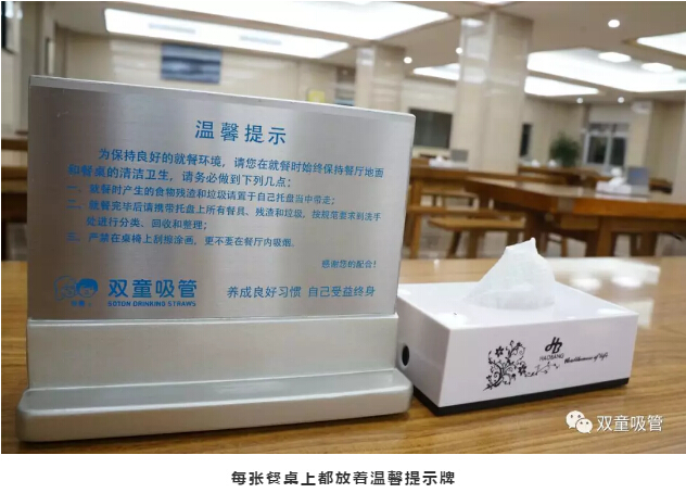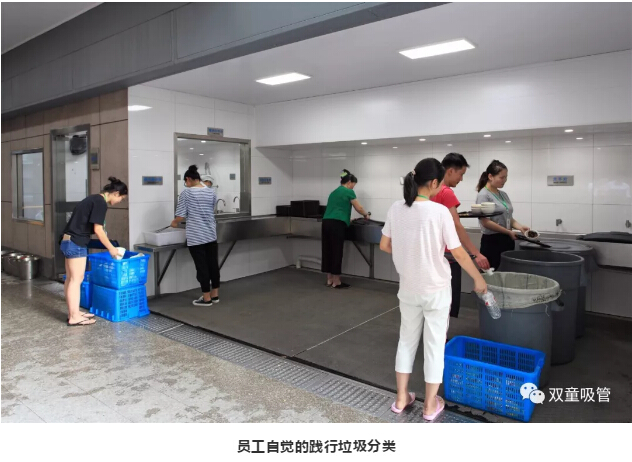 4.“雙童”大部分濕垃圾(餐廚垃圾)在餐廳的源頭給予分類(lèi),通過(guò)教育培訓并在每張餐桌上都擺放著(zhù)垃圾分類(lèi)的標語(yǔ)提示牌,提醒員工們就餐后及時(shí)按食物垃圾、衛生紙、包裝物三種類(lèi)別分類(lèi)投放于洗碗出三個(gè)大桶中,其中的包裝物和紙張垃圾作為資源類(lèi)垃圾回收、食物垃圾供應給養殖戶(hù)作飼料回收,從而把企業(yè)所有的濕垃圾全部消滅;