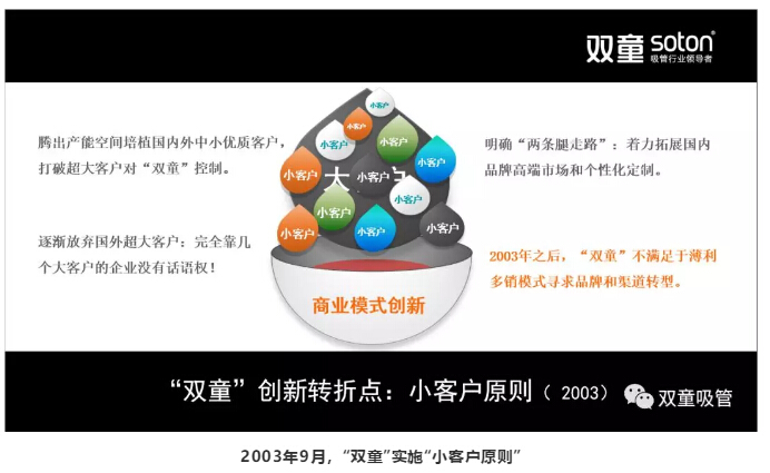 2003年9月,“雙童”實(shí)施“小客戶(hù)原則”,通過(guò)商業(yè)模式改革,改變了原來(lái)薄利多銷(xiāo)的粗放經(jīng)營(yíng)模式,通過(guò)獨樹(shù)一幟的銷(xiāo)售創(chuàng )新形成差異化錯位競爭,逐漸遠離同行之間惡性競爭,在持續積累下獲得全球吸管產(chǎn)業(yè)話(huà)語(yǔ)權和規則制定權。