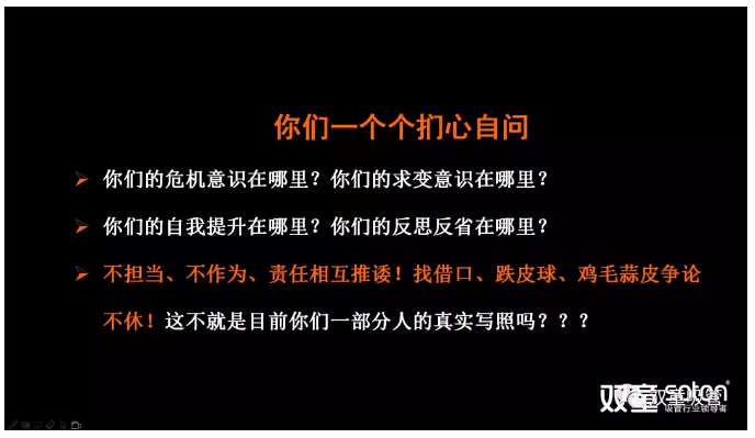 “雙童”樓仲平圍繞《危機重重下“雙童”路在何方?——“向死而生”我們只有六個(gè)月!》主題,通過(guò)兩個(gè)多小時(shí)的深入分享,讓行政員工們意識到“雙童”目前存在的嚴重問(wèn)題,引導大家認識自我、反思批判,打開(kāi)思想的缺口!