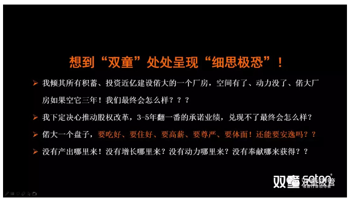 或許,大家覺(jué)得“雙童”發(fā)展的很好,為什么會(huì )“死”?為什么離“死亡”只有六個(gè)月?為什么時(shí)隔七年(2011年,“雙童”推動(dòng)經(jīng)理人再造重大變革)再次推動(dòng)企業(yè)重大改革?