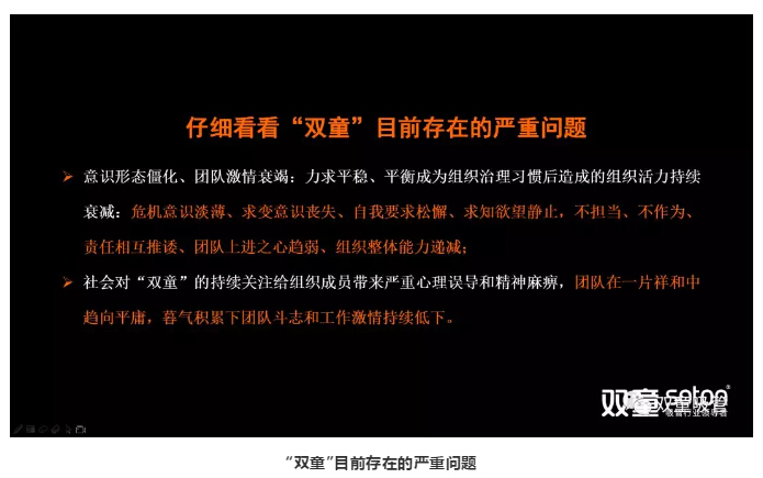 本次改革早在幾個(gè)月前,樓仲平就組織管理層進(jìn)行深度反思,對“雙童”近幾年工作進(jìn)行總結梳理,找出“雙童”近三年以來(lái)存在的問(wèn)題,比如: