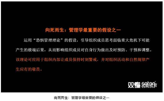 德國哲學(xué)家馬丁·海德格爾提出“向死而生”,引導人們正確認知“死”的概念來(lái)激發(fā)我們內在“生”的欲望,以此激發(fā)人們內在的生命活力。通過(guò)對“死”反悟,生命(組織或企業(yè))是可以延長(cháng)的,從而煥發(fā)出組織積極活力!
