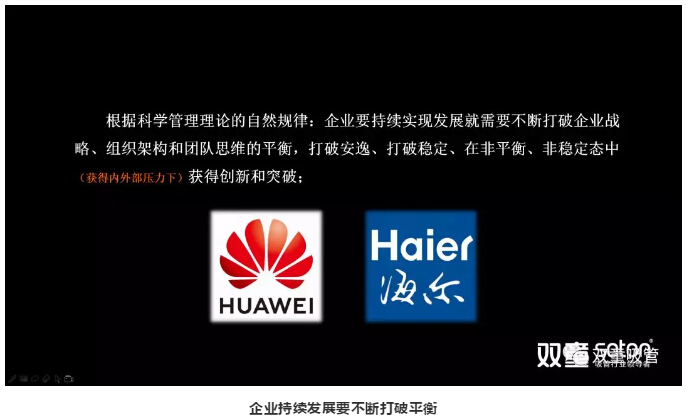 接下來(lái),樓仲平用華為及海爾的案例,引導大家認知:企業(yè)要持續實(shí)現發(fā)展就需要不斷打破企業(yè)戰略、組織架構和團隊思維的平衡,打破安逸、打破穩定、在非平衡、非穩定態(tài)中(獲得內外部壓力下)獲得創(chuàng )新和突破!