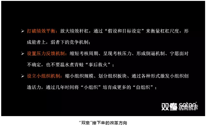 在這次變革中,“雙童”第一次破天荒提出了以“死亡”為假設命題,引進(jìn)“向死而生,置于死地而后生”的概念讓團隊意識到自己所面對的危機,從而讓員工和組織管理層認知到死亡即將到來(lái)之時(shí),激發(fā)團隊產(chǎn)生強烈危機感,從而實(shí)現對組織管理的及早干預,以此推動(dòng)企業(yè)獲得“生”的能力,獲得組織生命的延伸!