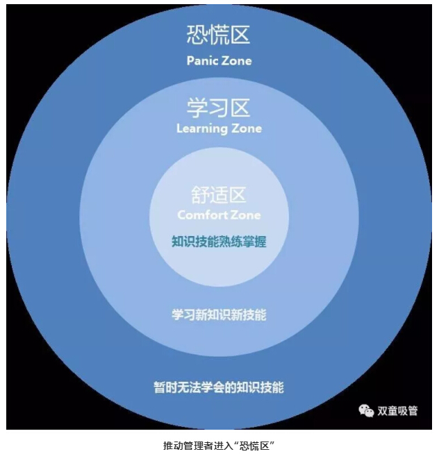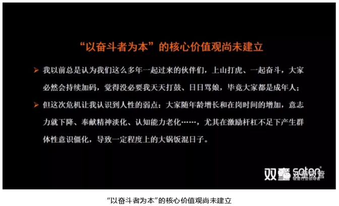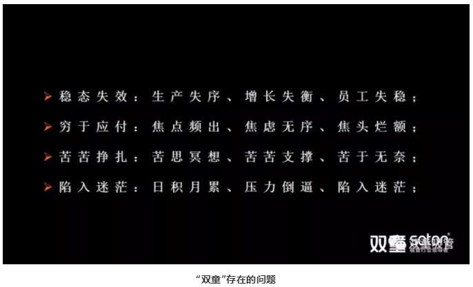 由于社會(huì )環(huán)境的復雜性、時(shí)代的巨變性和企業(yè)的自然墮變性,當家人樓仲平意識到“雙童” 直面“生死劫”!隨即通過(guò)“向死而生”的命題假設,讓團隊認知到雙童離“死亡”只有六個(gè)月,以此激發(fā)員工的危機感,從而讓“雙童”管理層再次脫離“舒適區”,遠離“危險區”,進(jìn)入“恐慌區”!通過(guò)對“死”的反悟,激發(fā)組織活力,從而得以延續獲得“生”的能力。