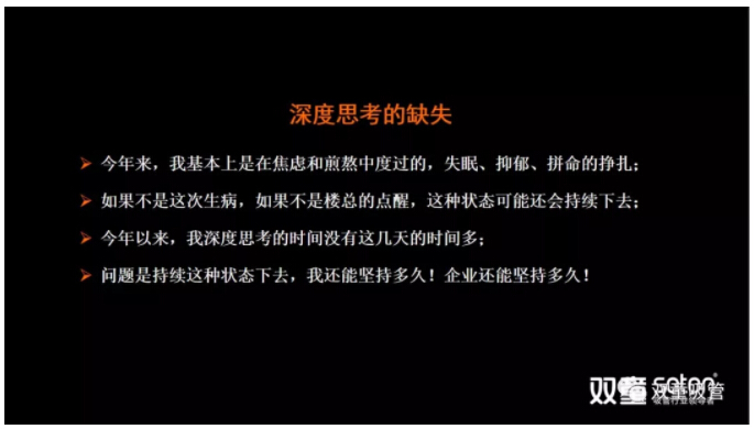1自我反思:我是怎么了?首先,總經(jīng)理李二橋就自己存在的問(wèn)題進(jìn)行了反思:“我缺乏深度思考,存在著(zhù)思維遮蔽。今年以來(lái),我一直像救火隊長(cháng)一樣,不停地在救火,不停地陷入到具體事務(wù)當中,從而無(wú)法集中精力來(lái)深度思考企業(yè)管理方面的問(wèn)題?!?/span>