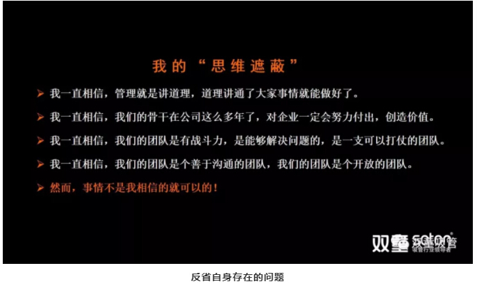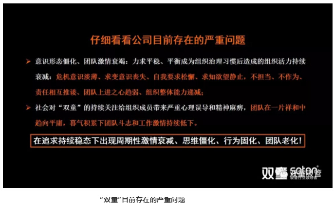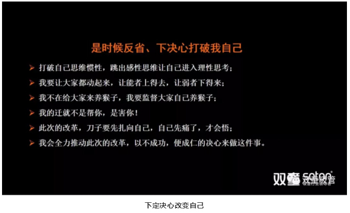 “所以是時(shí)候反省,并下決心打破自己!打破自己的思維慣性,跳出感性思維進(jìn)入理性思考,勇于突破和改變自我,下定決心再次推動(dòng)‘雙童’改革?!?/span>