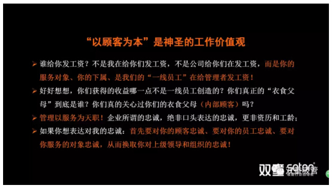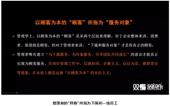 管理學(xué)上,以顧客為本的“顧客”所指為“服務(wù)對象”。對于企業(yè)整體來(lái)講,消費者、渠道商是顧客,但對于管理者來(lái)講,“下屬和服務(wù)對象”才是你真正的顧客,一線(xiàn)員工才是你真正的顧客。給你發(fā)工資的不是老板,而是你的下屬,你的服務(wù)對象,是我們的“一線(xiàn)員工”在給管理者發(fā)工資!